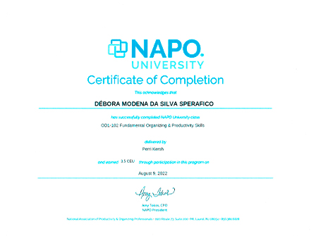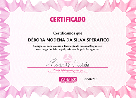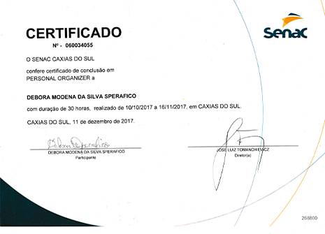 Possuo certificados Nacionais e Internacionais em diversas áreas como profissional Personal Organizer.
